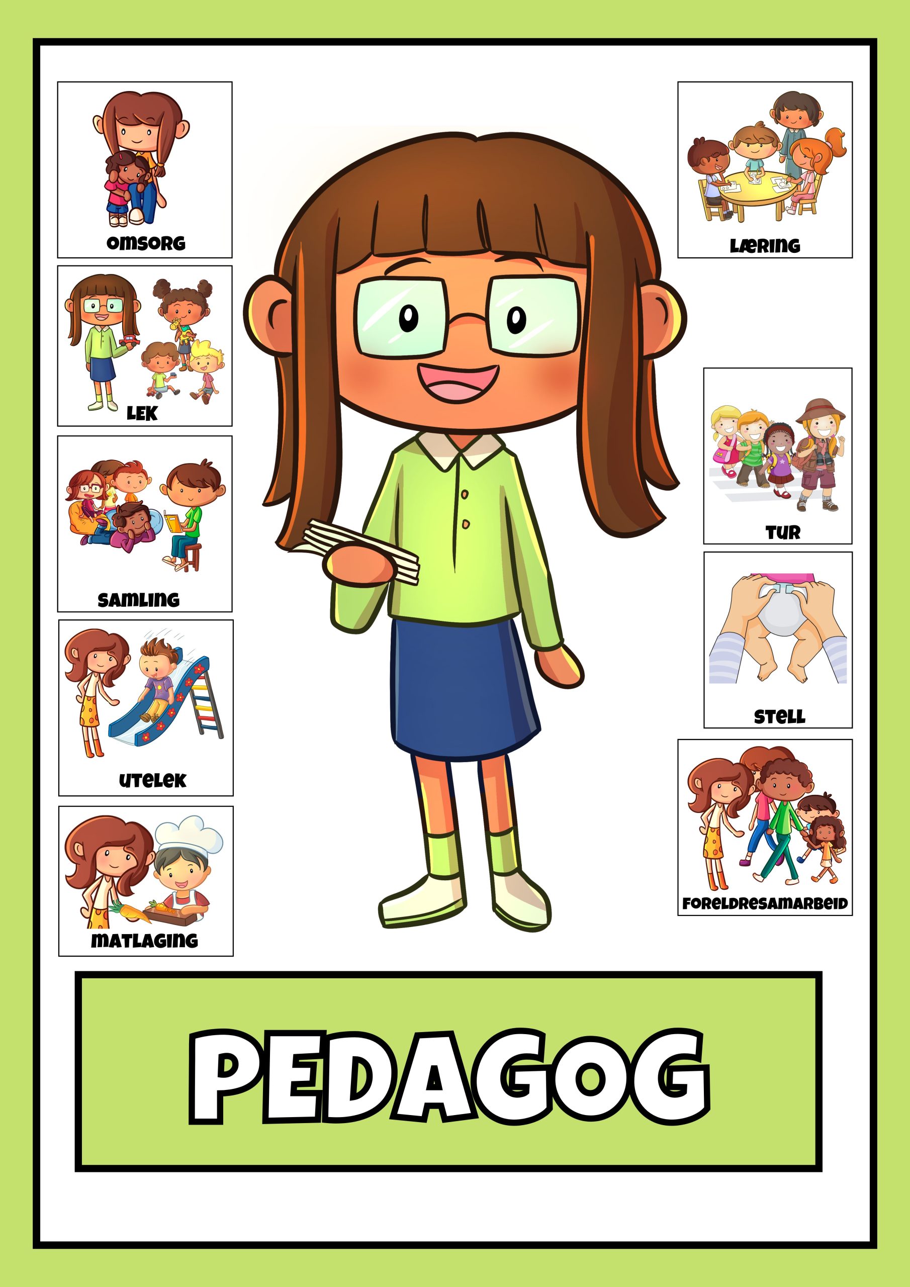 Inviter barna med i samtaler om ulike yrker. Inneholder: 38 illustrasjonskort av 36 ulike yrker. Se eksempelbilder.