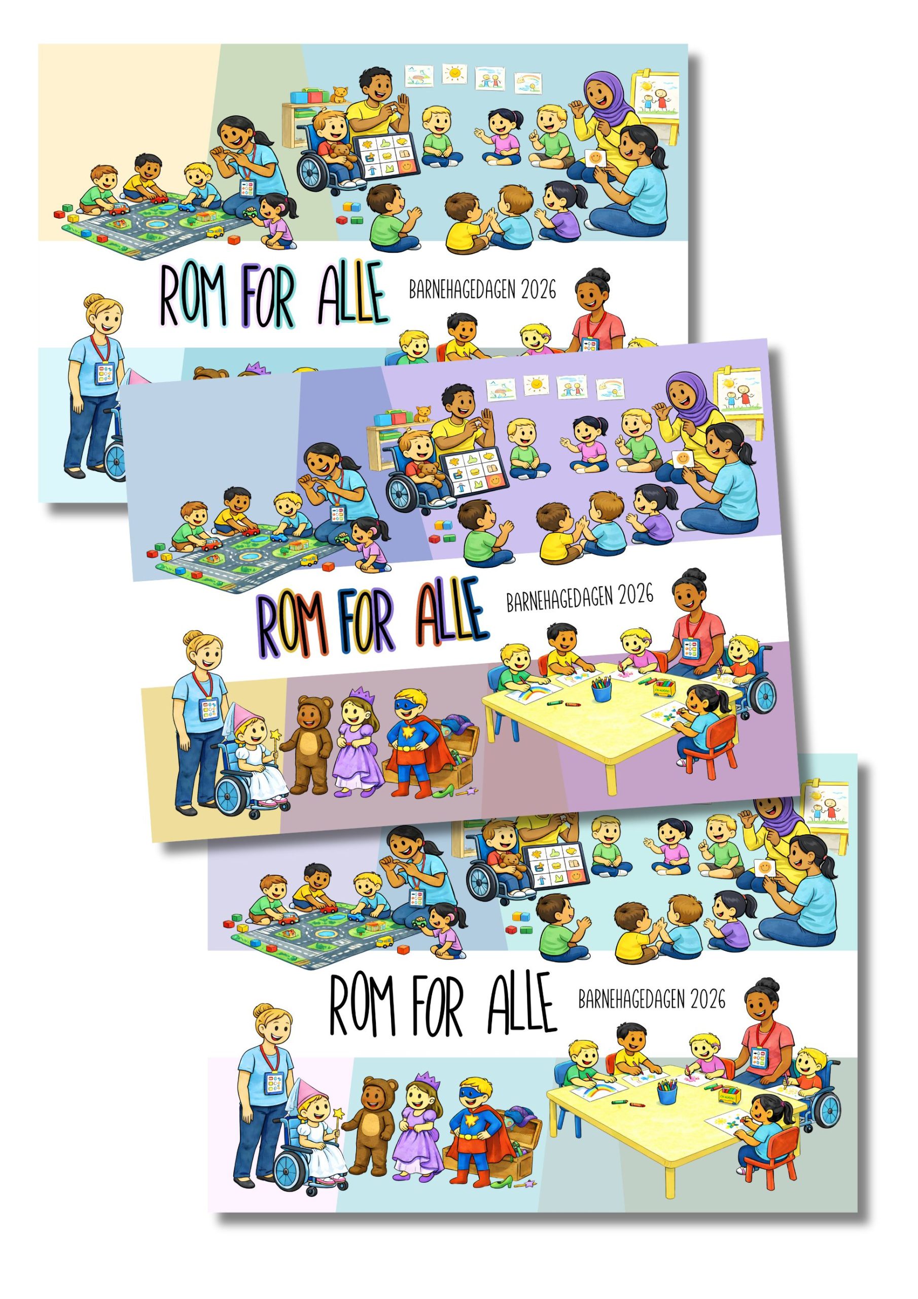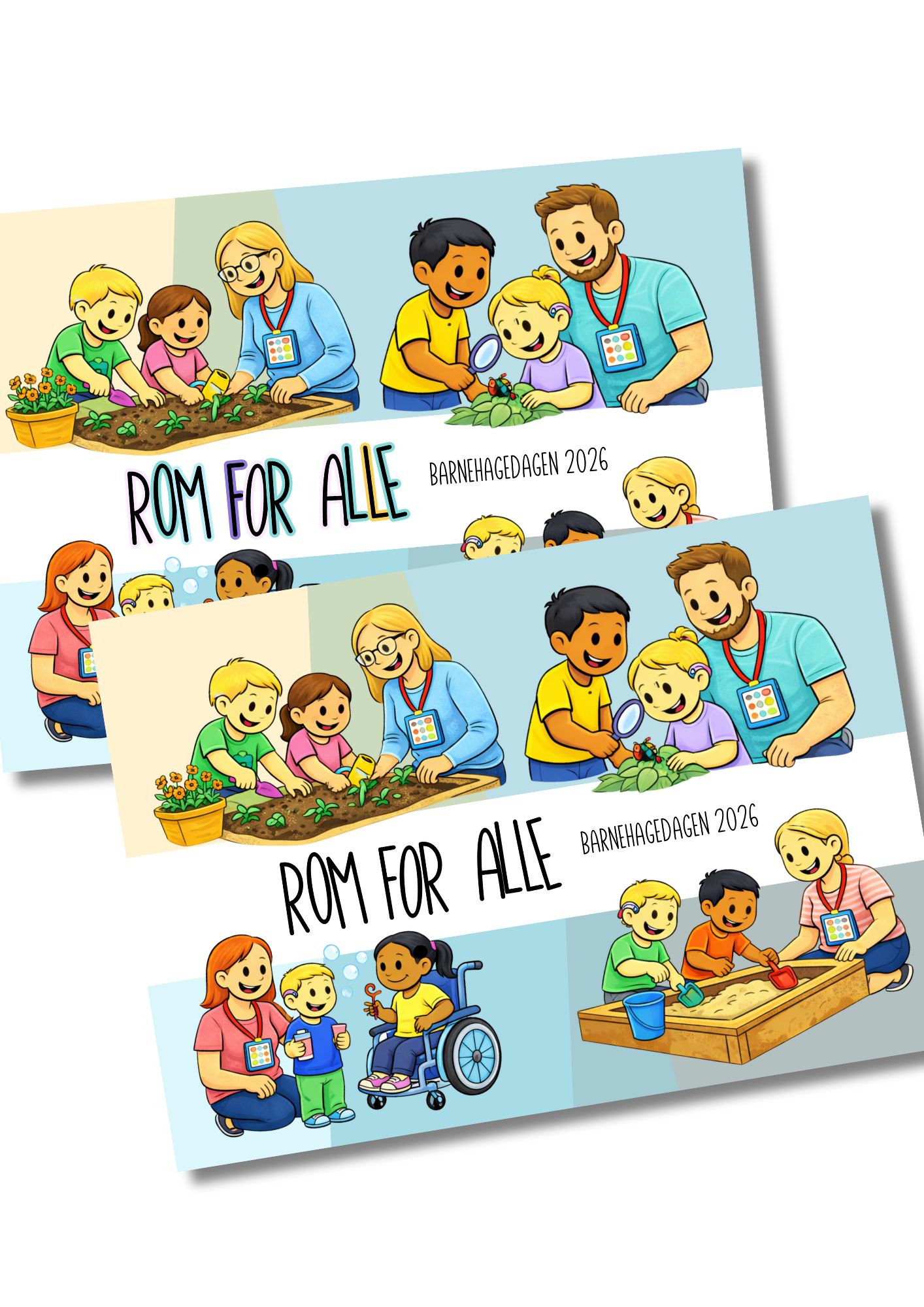 Plakat til tema ROM FOR ALLE, som er temaet på barnehagedagen 2026. Sendes som bildefiler og pdf fil. Skriv ut i valgfri størrelse. Illustrerer utelek og innelek.