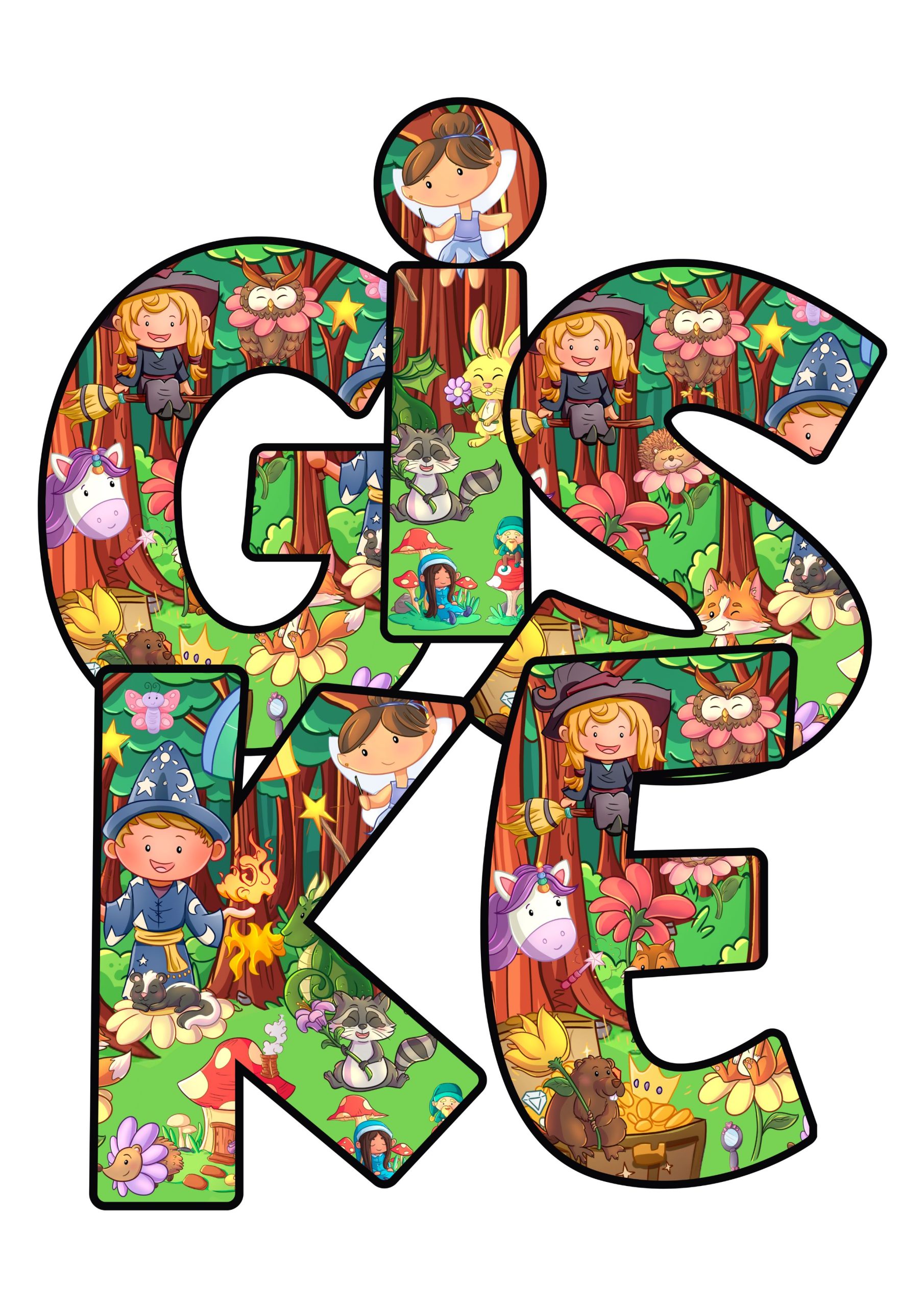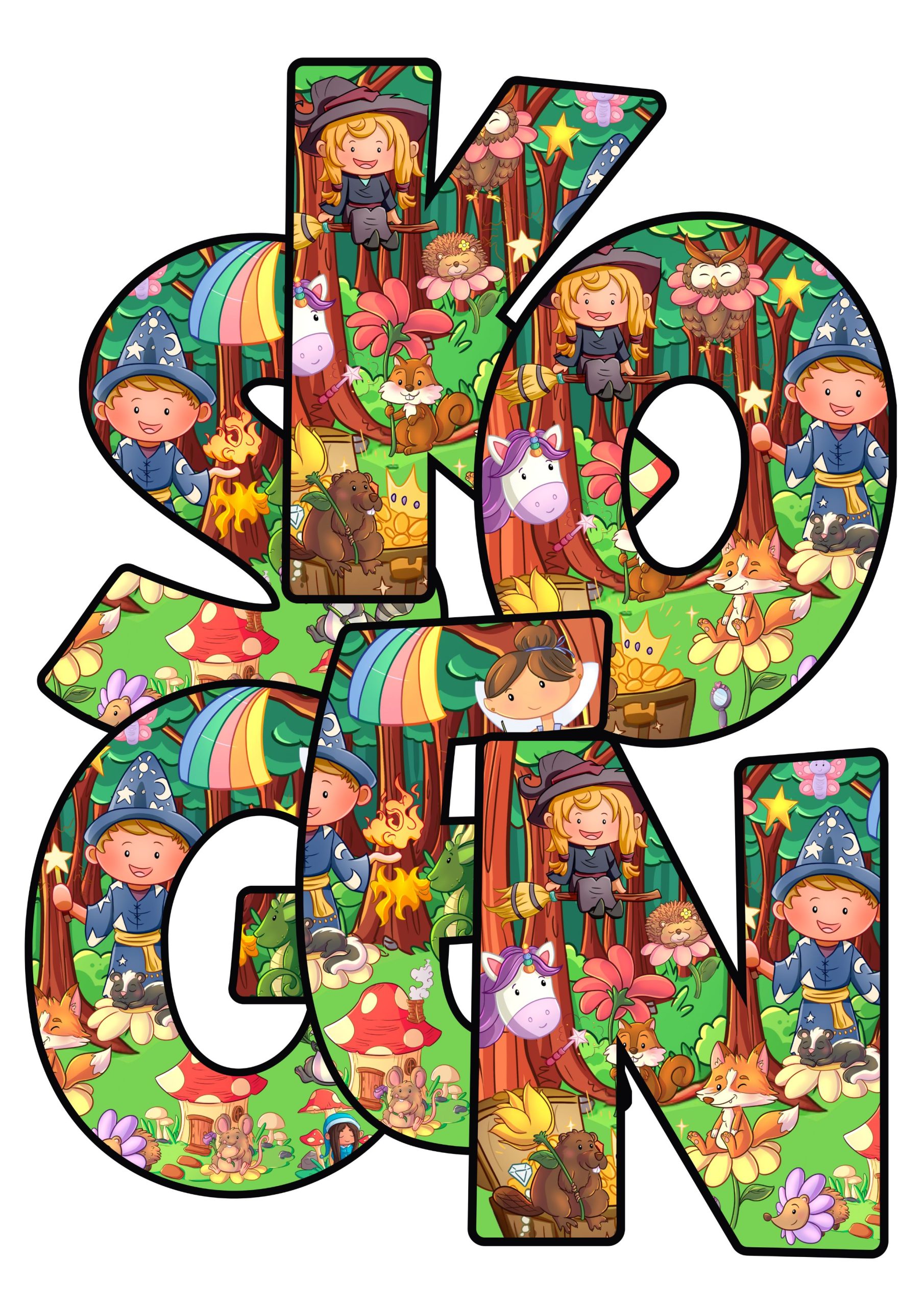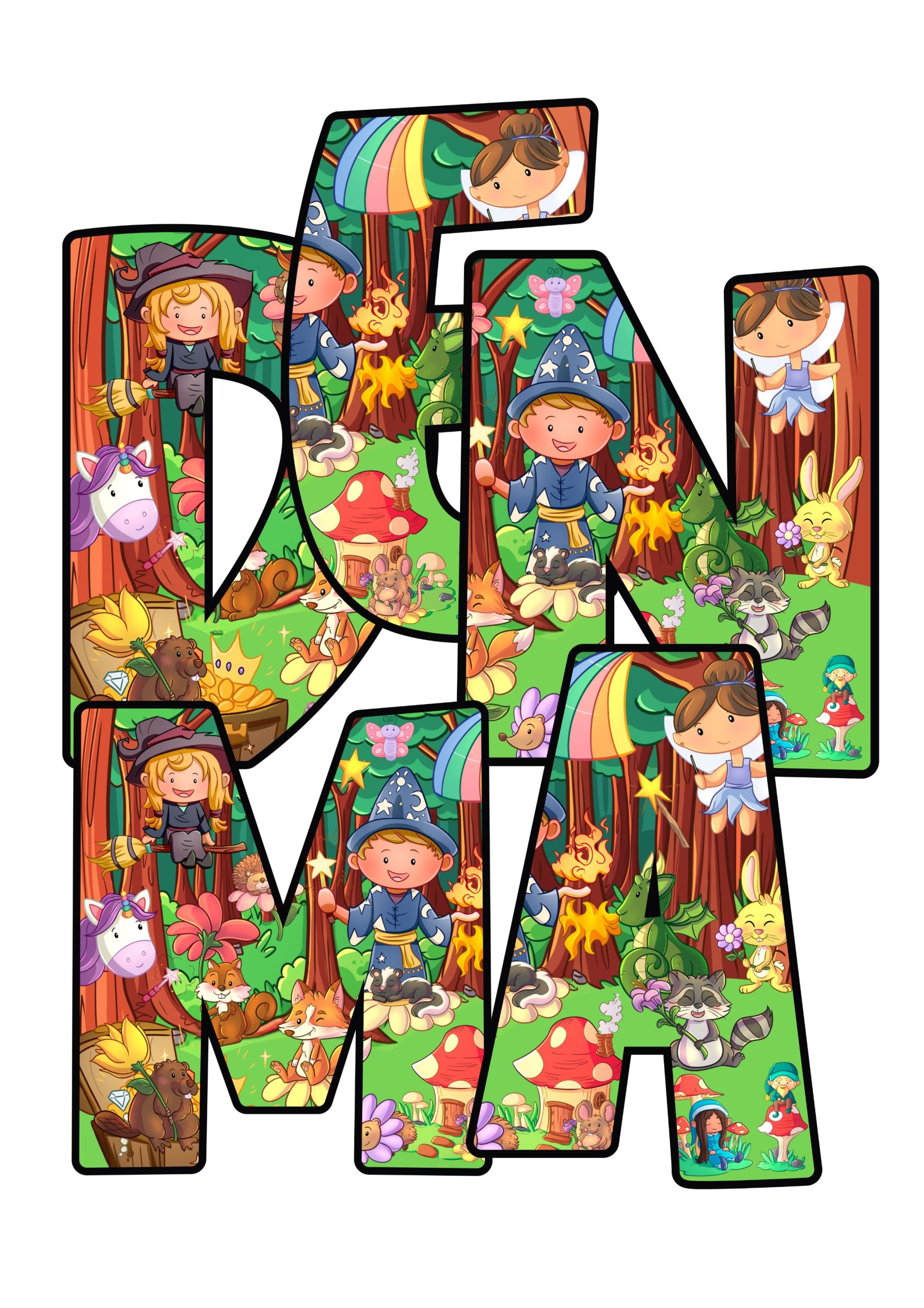 Dekorbokstaver til tema DEN MAGISKE SKOGEN. Sendes som bildefiler og PDF fil. Skriv ut i valgfri størrelse. Klipp rundt bokstavene og heng opp.