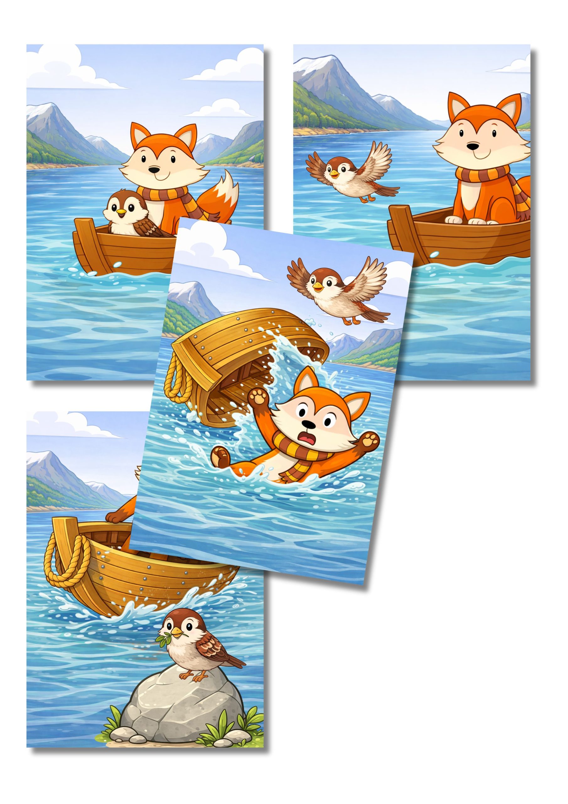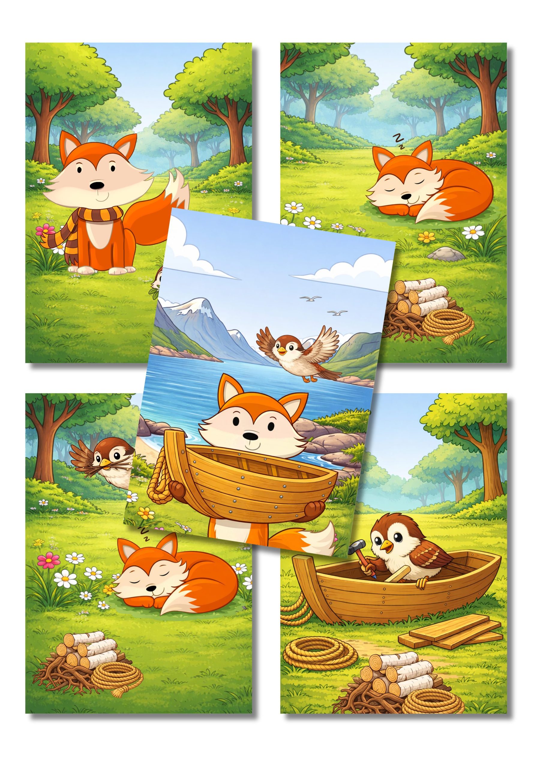 Fortellerkort om spurven og reven som bygget båt.