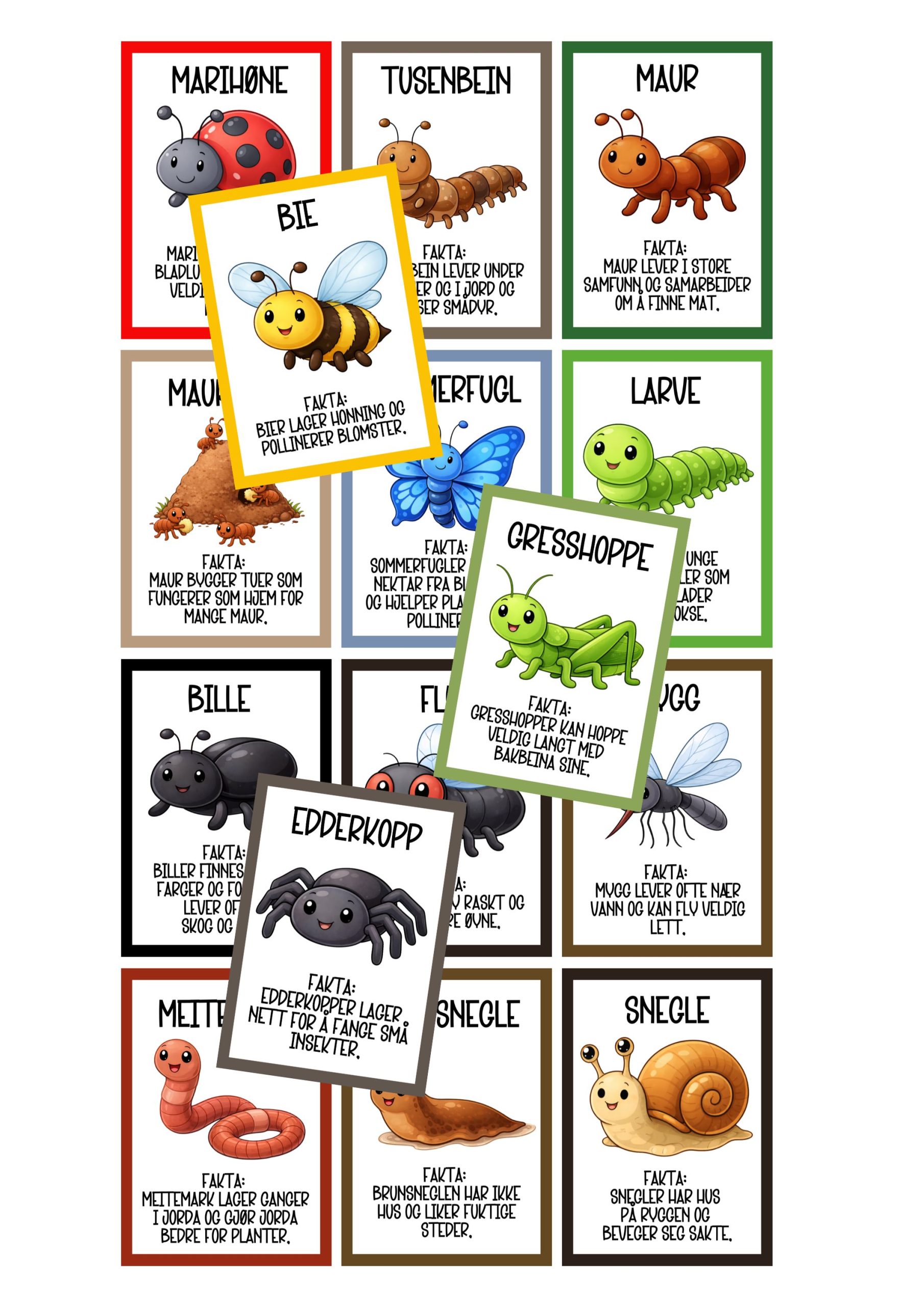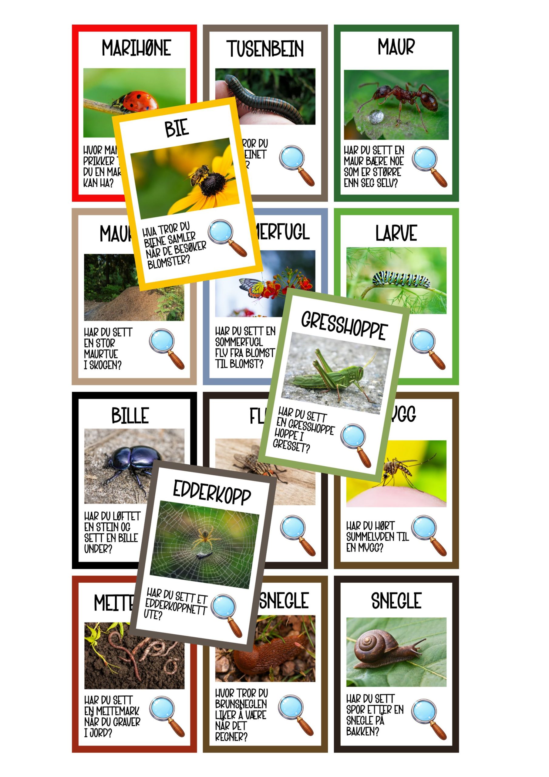15 plakater/samtalekort med illustrasjoner og fotografier av ulike insekter og småkryp man kan finne i naturen. Kortene kan skrives ut dobbeltsidig, med illustrasjon på ene siden, og fotografi på andre siden. Den ene siden har en faktasetning, den andre siden har et spørsmål knyttet til insektet/småkrypet, som kanskje kan motivere på turdager?
